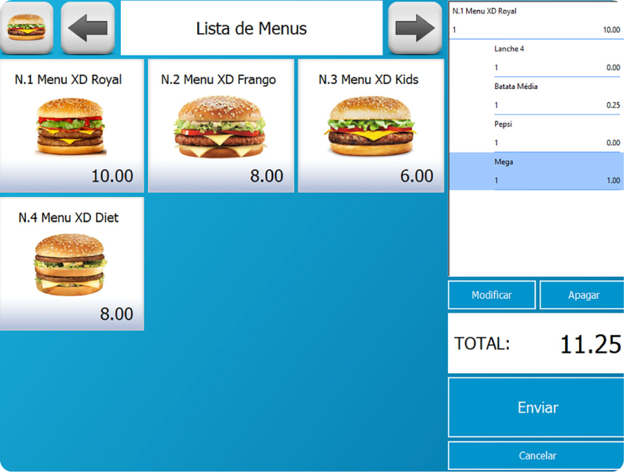 Criação de menus por etapas tipo Fast-Food ou automático tipo Menu do Dia.